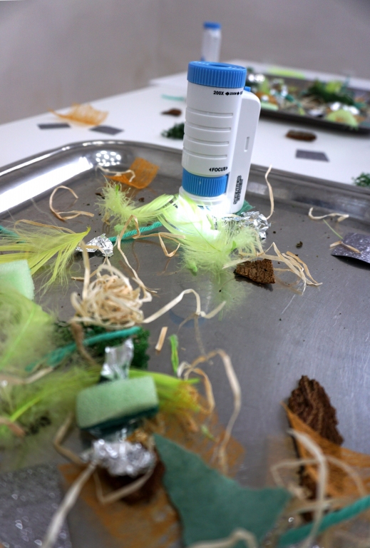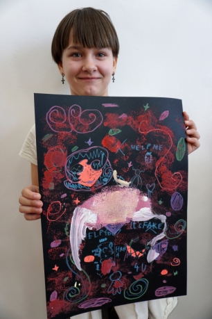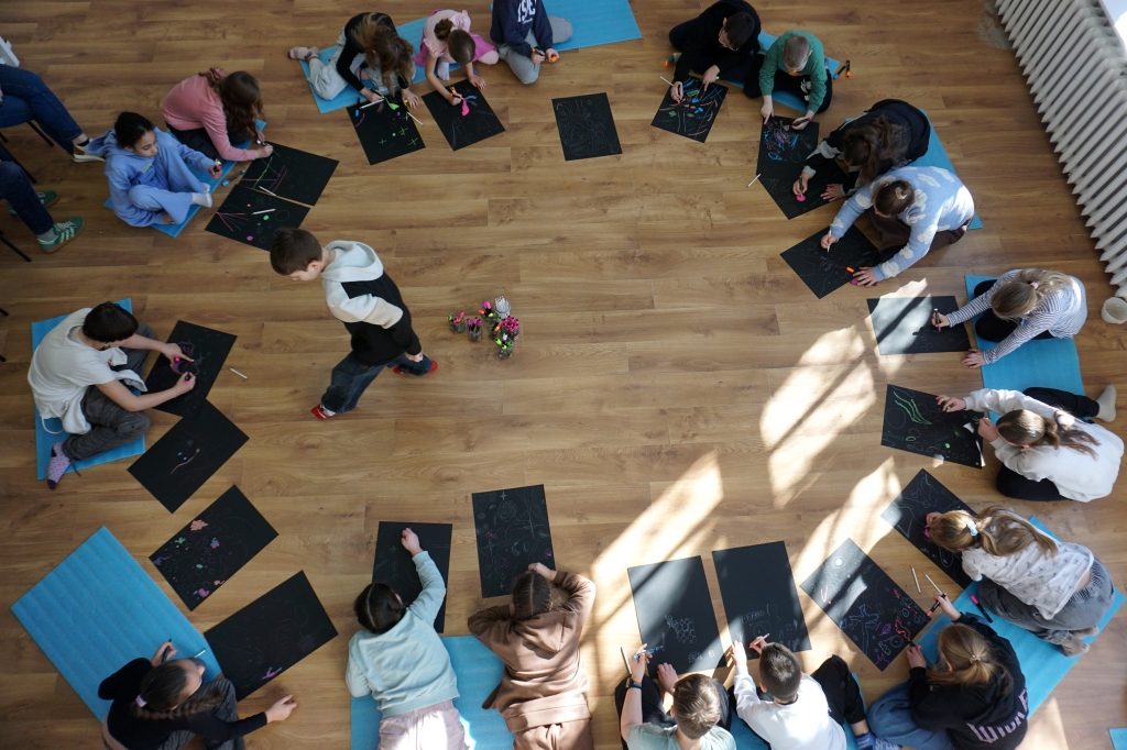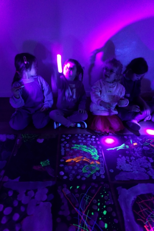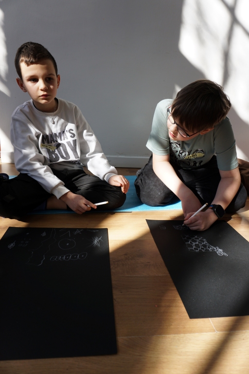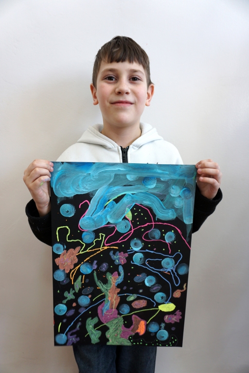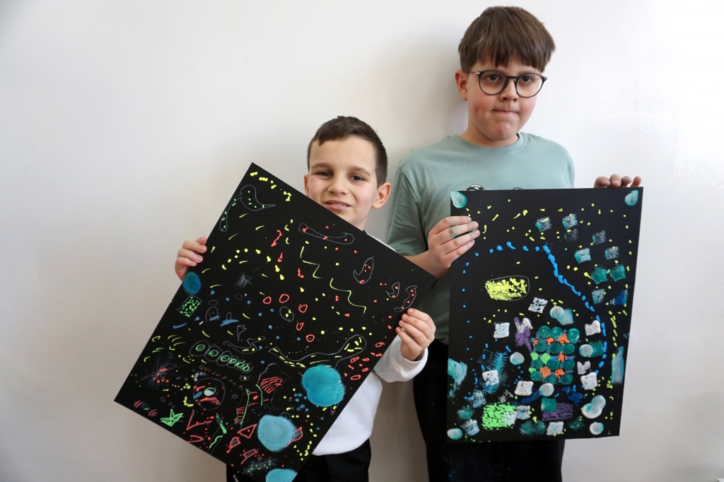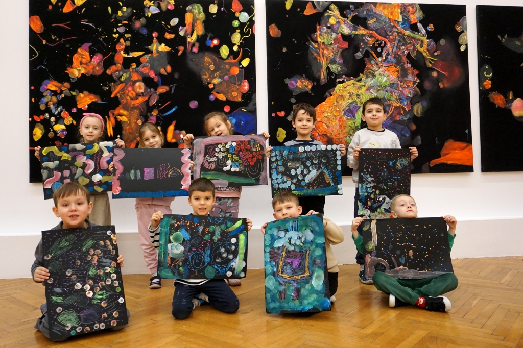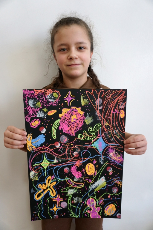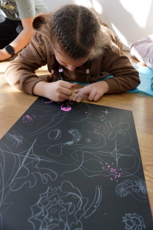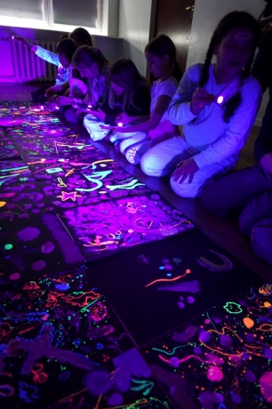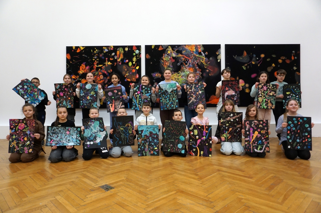 Podczas kolejnych warsztatów dzieci zwiedziły wystawę Anny Kołackiej. W części praktycznej zainspirowały się obrazami artystki i tym co zobaczyły pod mikroskopem, tworząc abstrakcyjne obrazy na czarnym tle z użyciem mazaków fluo i farb.
